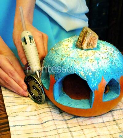 Кстати, если у вас нет готовой высушенной тыквы, а поделку нужно сделать срочно, то можно взять и свежую, правда тогда придется смириться с тем, что ваше произведение не будет вас долго радовать.