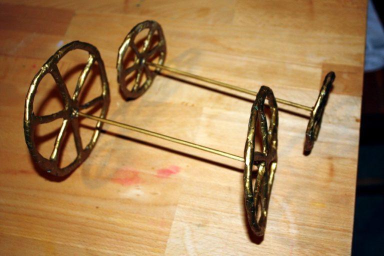 Чтобы соединить все 4 колеса используйте толстую проволоку, шпажки или ровные ветки. Сделайте по одному отверстию в центре каждого колеса и проденьте в него шпажку. Снаружи можете закрепить палочку пластилином, глиной или надеть бусину или гайку, чтобы колесо не слетело.