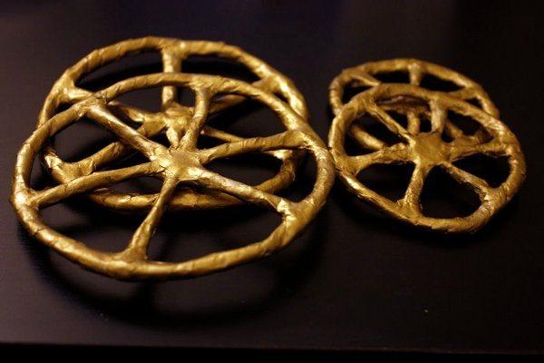 Чтобы сделать колеса для кареты из металлических крышек, их вначале обезжиривают, после чего окрашивают акриловыми красками и покрывают лаком. Можно нарисоватьна них спицы.