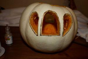 Теперь приступаем к изготовлению самой кабины кареты. Если вас не устраивает цвет тыквы, то ее можно покрасить. Далее, при помощи карандаша, стоит нарисовать все планируемые окошки и вырезать их аккуратно острым ножом. Предварительно можно маркером нарисовать места, где будут двери и окна.