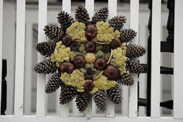 4. Если хотите изготовить ручку для корзины, то можно попробовать сделать из шишек полукруг, соединяя их проволокой или используя для этого жидкие гвозди.