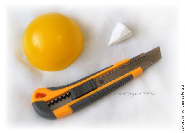 Разрезаем пластмасовый шарик пополам. (Для основы можно использовать половинку пенопластового шарика). Вырезаем из пенопласта мордочку нашего будущего ёжика. Из картона вырезаем донышко нужного размера.