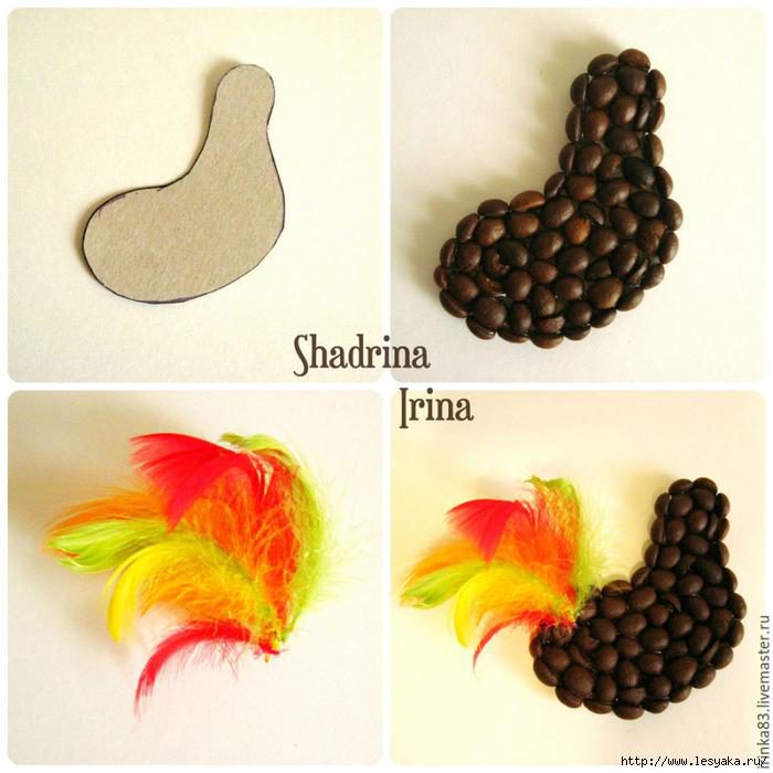 Я хочу вам предложить мастер-класс от Ирины Шадриной и сделать вместе с ней сувенир-магнитик на холодильник из зёрен кофе, который она назвала "Петушок Петруша"