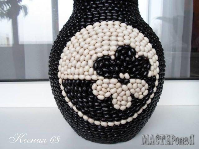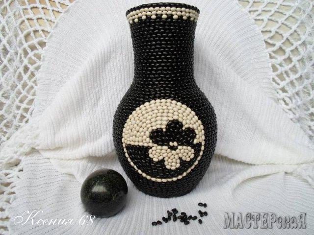 Интересное применение черной и белой фасоли — декорирование глиняного горшочка и создание эффектного панно.