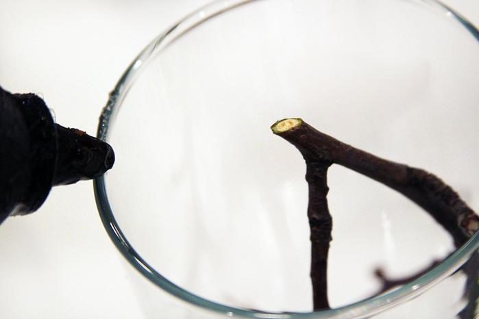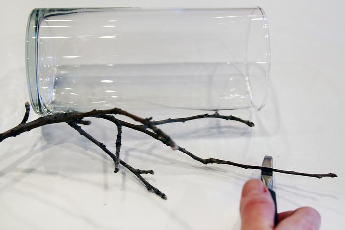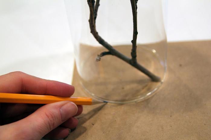 Приклеить верхушку ветки к дну стакана.