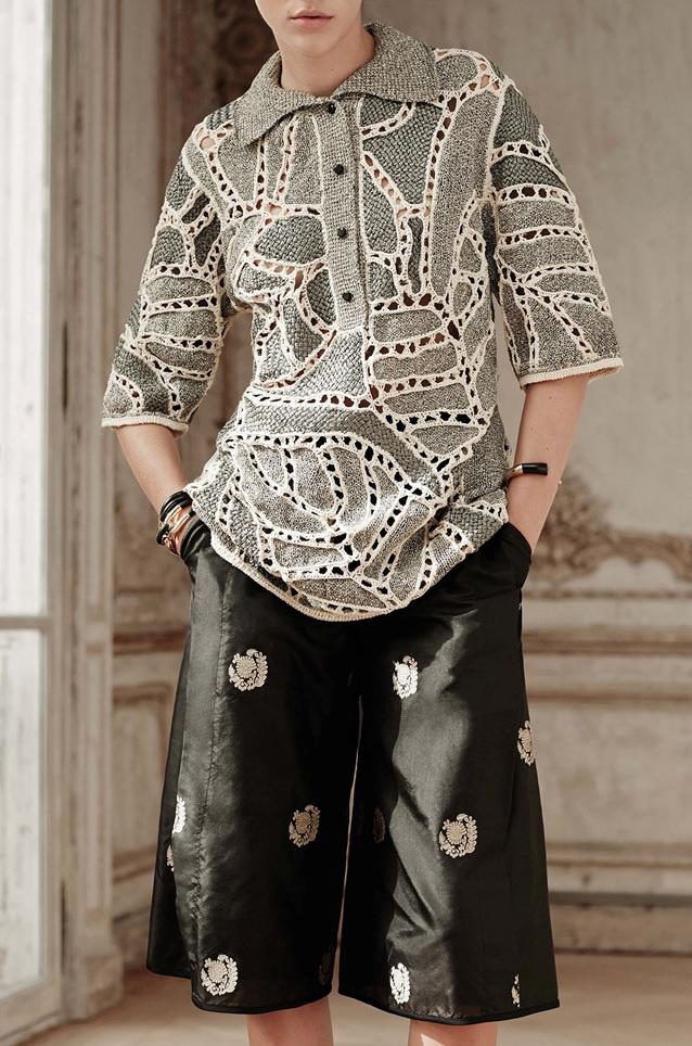 Модели выполнены как бы в технике ирландского вязания — кусочки трикотажа обвязали крючком и соединили с помощью столбиков с накидом.
