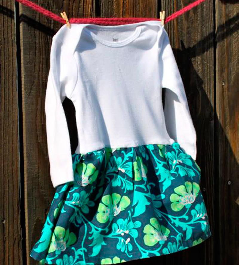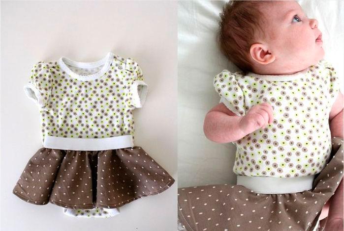 Из такого комбинезончика можно легко сделать платье, пришив к нему юбку. Можно даже не отрезать низ, а просто пришить юбочку сверху.