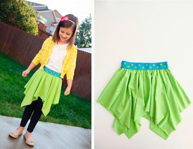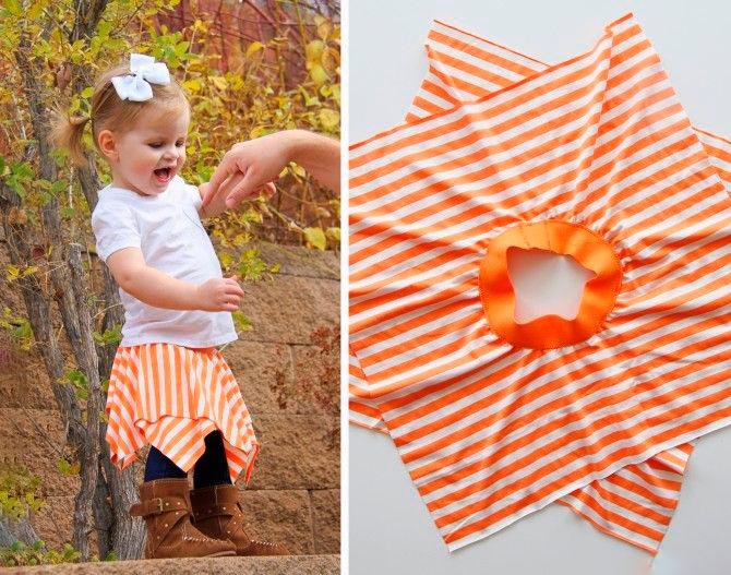 Такую двухъярусную юбочку сшить очень просто: возьмите два квадрата ткани и сложите их так, чтобы углы одного квадрата выступали (см. фото), а по центру пришейте широкую резинку. Яркая и нарядная юбка понравится каждой девочке.