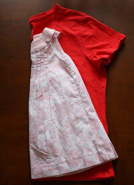Платье из рубашки сшить довольно просто. Возьмите мужскую рубашку и детское платье подходящего размера. Разложите вещи ровно (как показано на фотографии) и, предусмотрев припуски на швы, вырежьте, а затем сшейте.