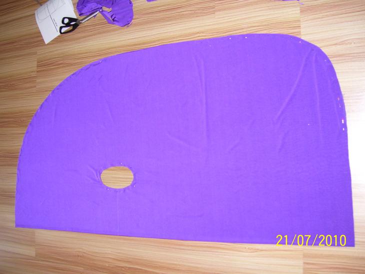 Сложить ткань пополам, срезать лишнее согласно выкройки, Вырезать пройму. Стачать и пришить пояс. Платье готово!