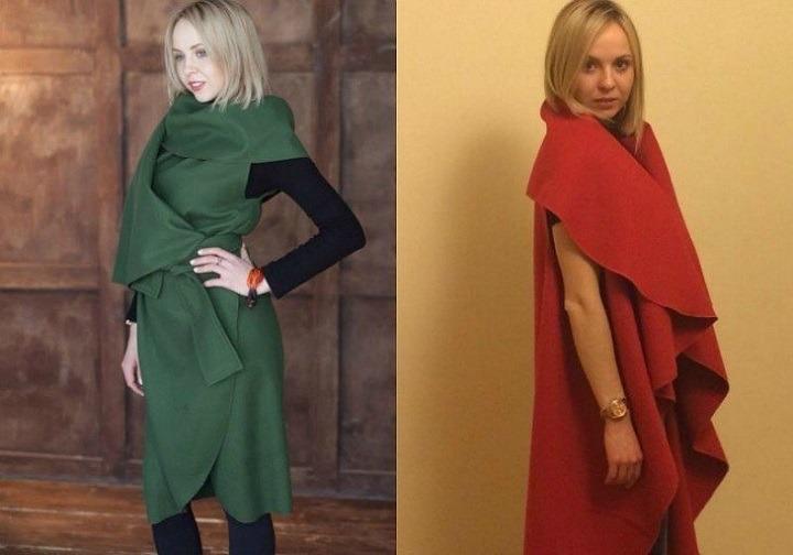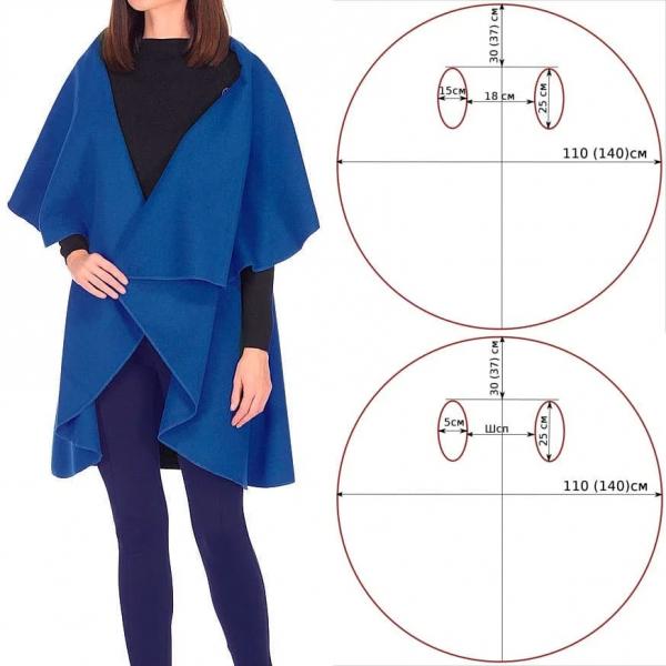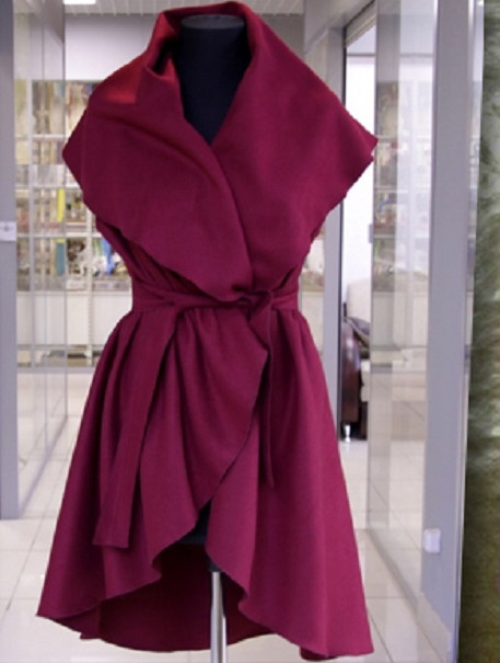Увидела в сети очень интересную модель жилета, выкройка которого представляет собой круг, поэтому сшить его сможет каждая из вас! Смотрится такой жилет-трансформер очень женственно и элегантно и, главное, по-разному. В ветреную погоду, например, воротник можно поднять и использовать, как капюшон, в теплую погоду его можно опустить на плечи. Если использовать пояс, то жилет можно сделать приталенным, а без пояса он будет ниспадать красивыми волнами.