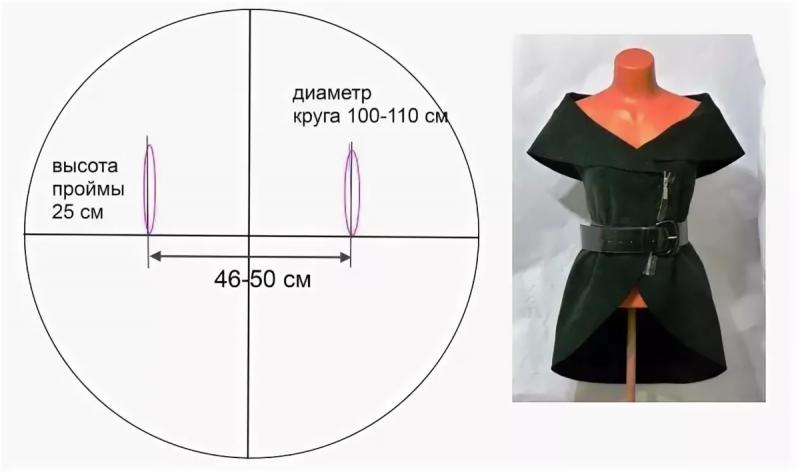 Делим круг на 4 части и, как показано на рисунке, чертим проймы на расстоянии 46−50 см. Высота проймы 25 см. Это для всех размеров подойдет.