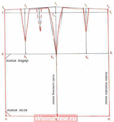 - Через точку Б2 прямую вверх и вниз, на пересечение с талией — Т3, низа — Н2 — получим боковой срез.