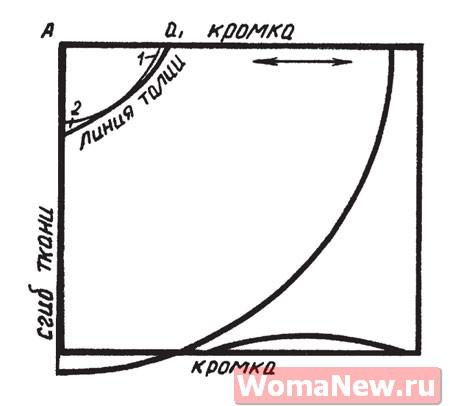 - Из угла А найденным радиусом проведите дугу от кромки до сгиба ткани. Увеличьте глубину выемки на 1 см по долевой нити, да и на 2 сантим. по поперечной. Благодаря этому фалды клеша будут располагаться равномерно.
