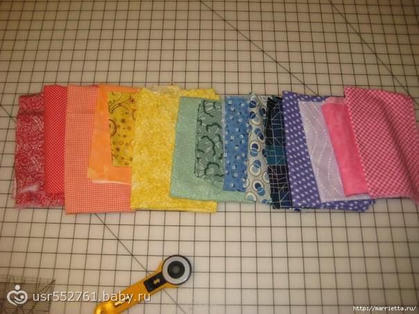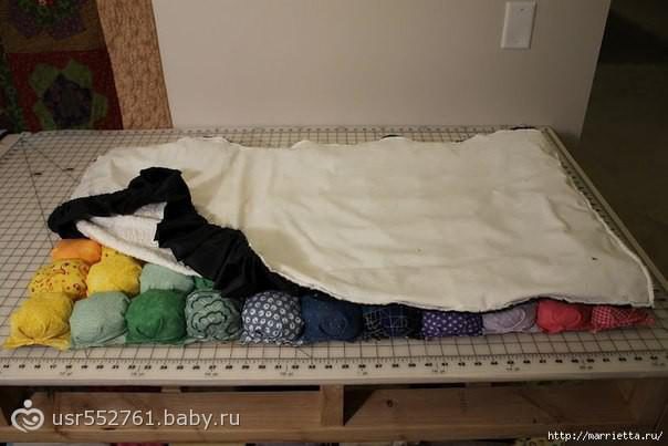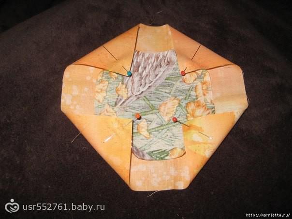 Как уже писали выше, вам понадобится любая, можно не очень красивая ткань. Из нее вырезаем квадраты больше тех, которые были в качестве лоскутов. Сложите некрасивый квадратик в один лоскуток, который выбрали до этого, и приколите уголки, как это показано на фотографии.