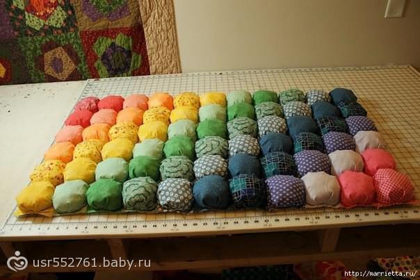 Любая мама скажет, что часто, когда ребенок еще маленький, хочется, чтобы он хотя бы 15 минут посидел спокойно, заинтересовался какой-то вещью и не дергал по пустякам. Коврик из шариков, как раз, и может стать таким отвлекающим маневром, пока мама стирает или готовит ужин, тем более, что делать его легко и интересно. Кроме того он очень мягкий, на нем тепло, а значит, ребенок сможет играть, ползать и греться одновременно.