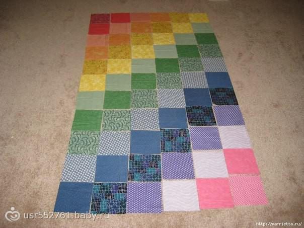 Для начала выберите, какие лоскутки из всех, которые нашли у себя дома, можно использовать. Теперь нужно из них вырезать квадраты, примерно 60 см на 60 см. располагать их вы уже будете по своему вкусу. Рассчитывайте примерно 11 в длину и 6 в ширину. Но все зависит от того, какого именно размера коврик вы хотите получить в итоге.