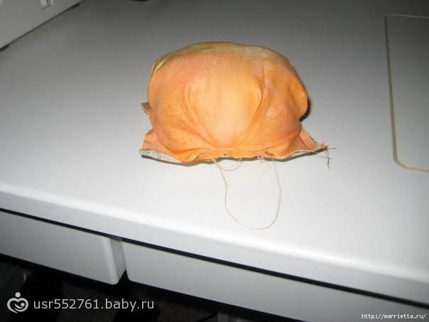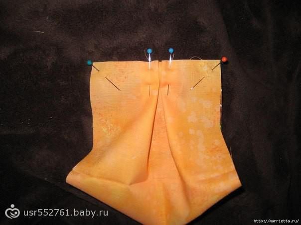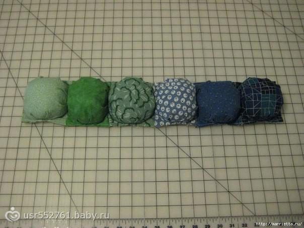 Когда все будет прикреплено булавками, можно застрочить квадратик на машинке. Следите, чтобы ваш шов не затрагивал сами складки. И оставьте один угол не прошитым. Теперь нужно набить туго затяжки, которые получились, в отверстие, которое мы для этого оставили. Лучше всего использовать не вату, а наполнитель. Также вы должны знать, что очень туго в данном случае нехорошо, так что сдерживайте себя.