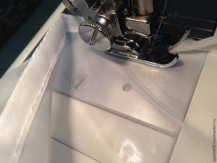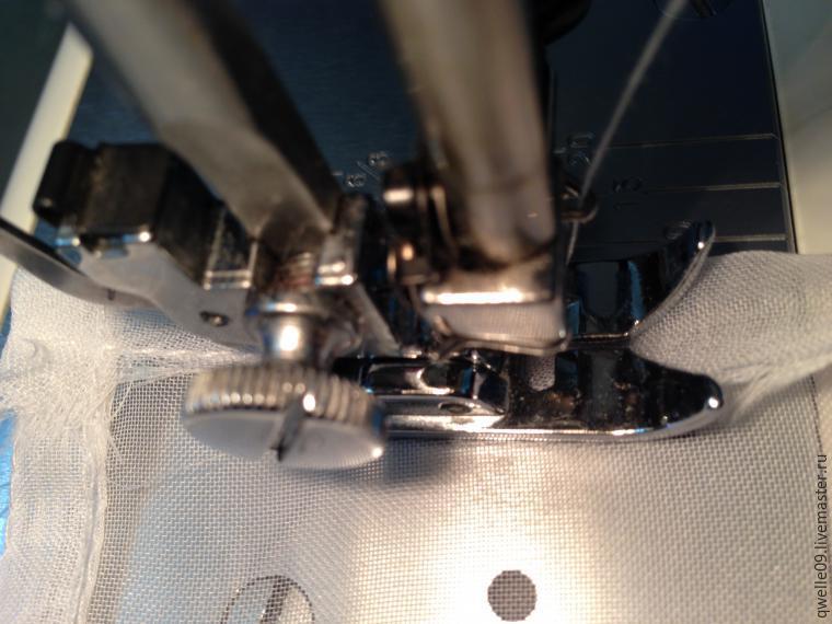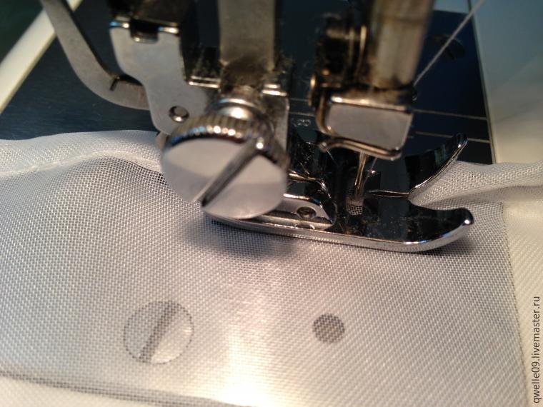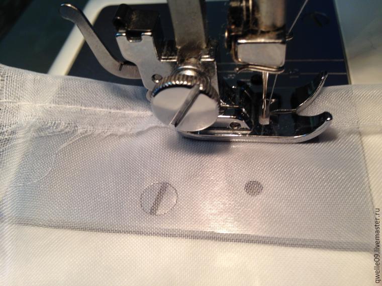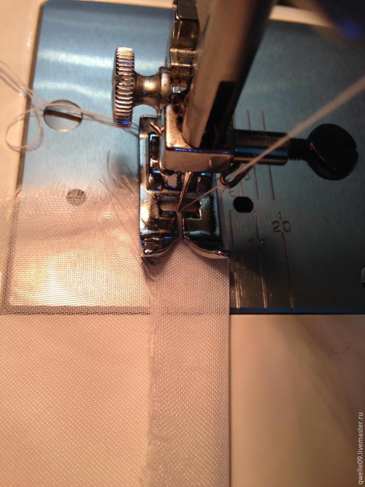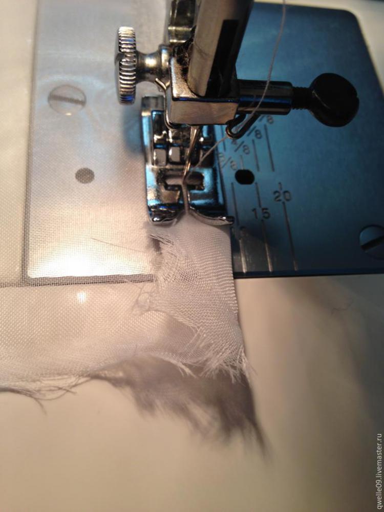 Берем вуаль, загибаем край на ширину лапки в машинке, заправляем под лапку и прокалываем иглой, убеждаемся, что ткань размещена ровно, край ткани не выходит за пределы лапки (в том числе и бахрома, это важно), прижимаем лапку.