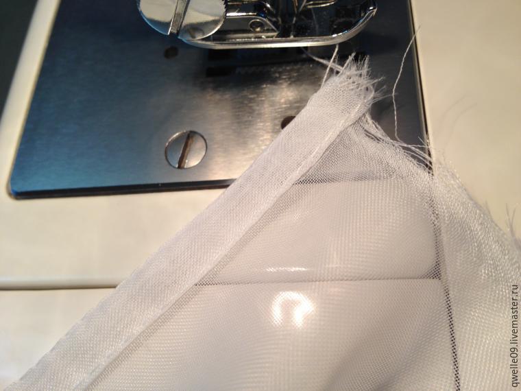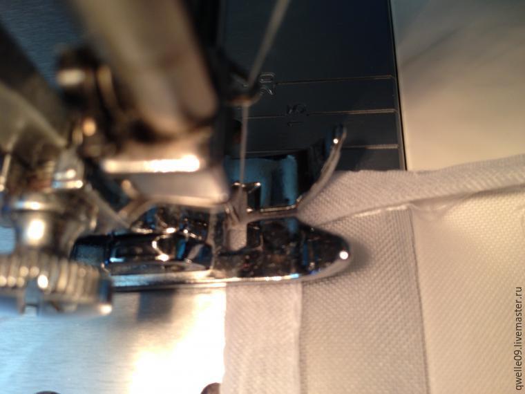 В процессе шитья заправляем, подгибаем ткань под лапку, следим, чтобы сохранялась одинаковая ширина ткани под лапкой.