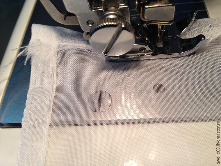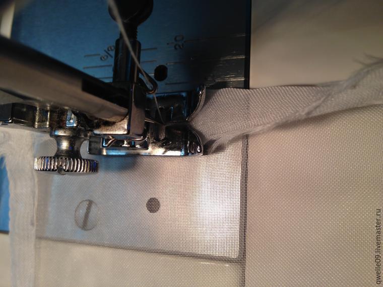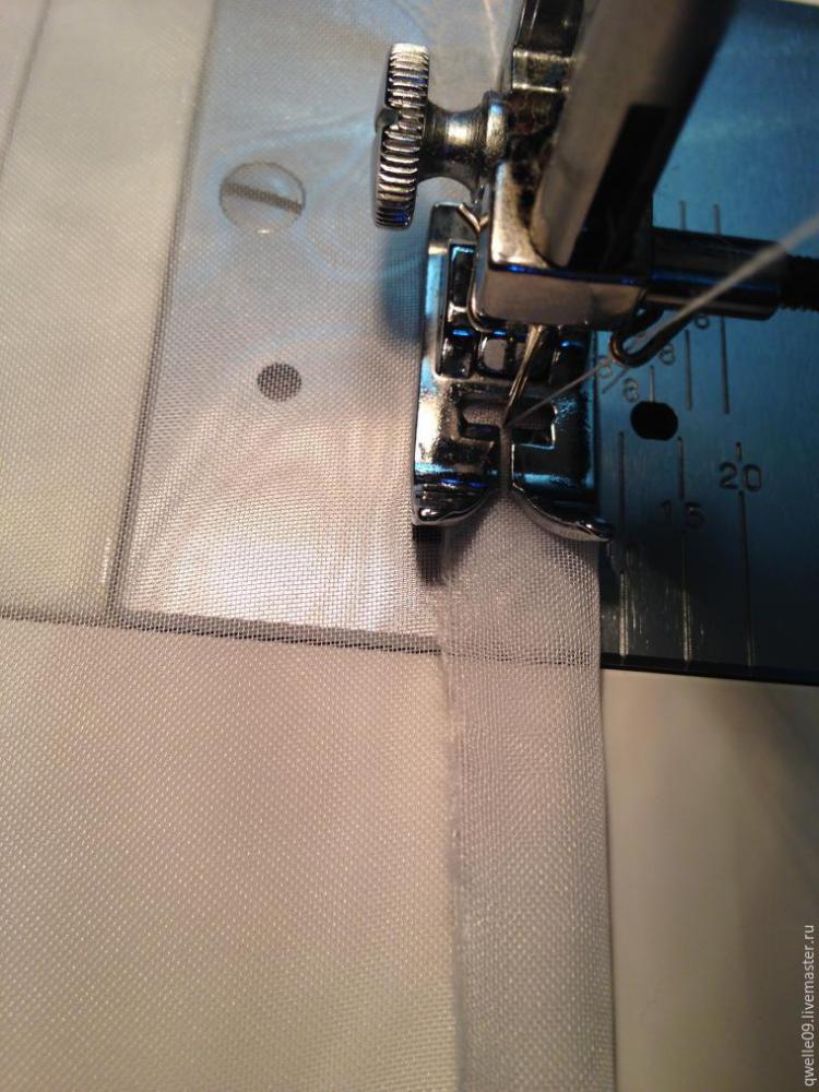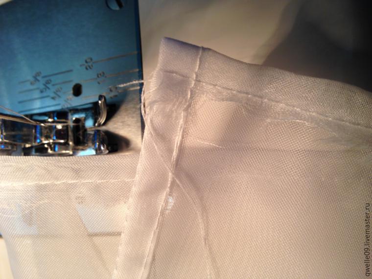 Итак, для того чтобы сшить или подшить занавески/тюль и прочее из такой ткани, нужно сначала подготовить эту самую ткань, то есть, отрезать (оторвать) кусок ткани нужного размера. Сразу скажу, на подгибку такой ткани при моем способе подшива уйдет 24 мм, сама подгибка получится шириной 8 мм. Внутри подгибки будет четыре слоя ткани. Мой способ подшивания вуали (или органзы) не требует наметки, процесс подшивания — это всего две строчки на машинке.