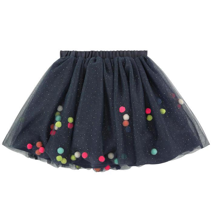 Все так просто: сшить (или взять готовую) юбку из более менее плотной ткани, а поверх нашить тонкую прозрачную. Накидать между этими слоями небольших помпончиков (я бы взяла мелкие, как на тесьме с помпошками бывают) и прострочить по низу.