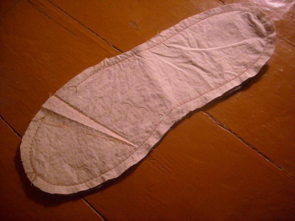 4. Выворачиваем стельку. Отстрачиваем её снаружи близко к краю по всему контуру, подвернув припуски открытого участка внутрь.