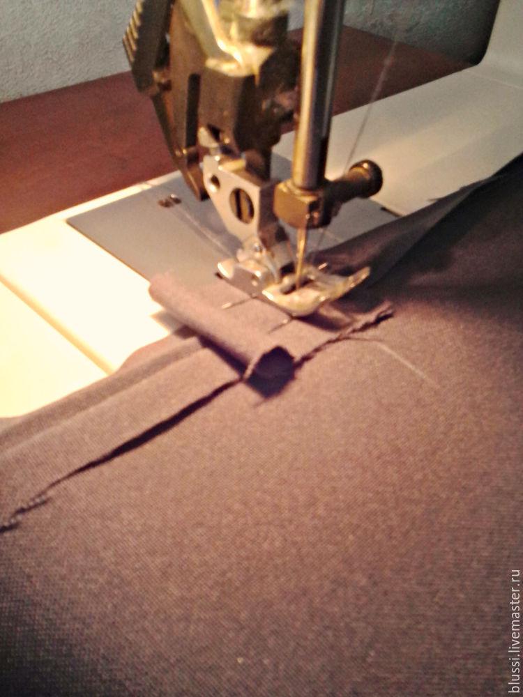Прокладываем две малюсенькие строчки по намеленным линиям, соединяя усилитель и запасы шва, от среза к среднему шву.
