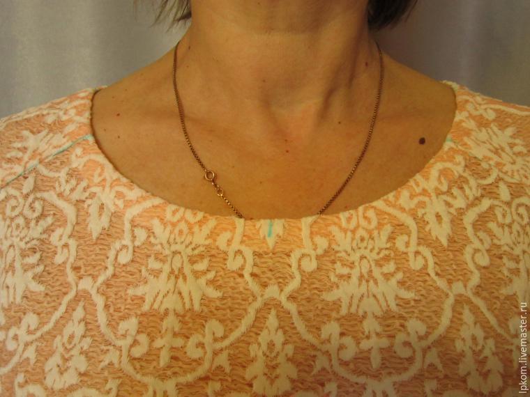 1. По линии горловины платья или блузки проложим машинную отметочную строчку, которая сделает более стабильным срез ткани, а также будет надежным ориентиром для совмещения с косой бейкой.