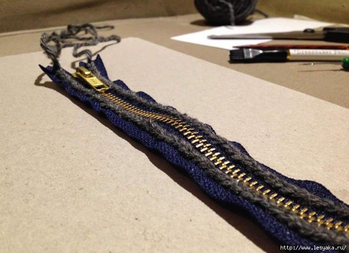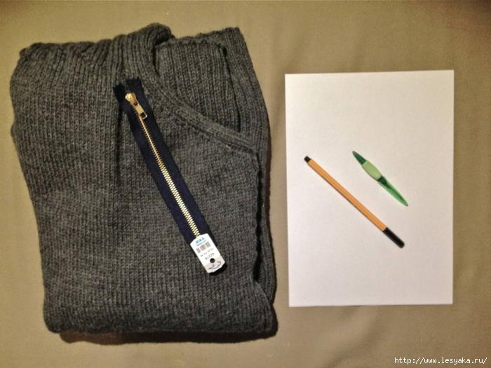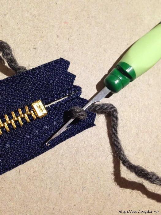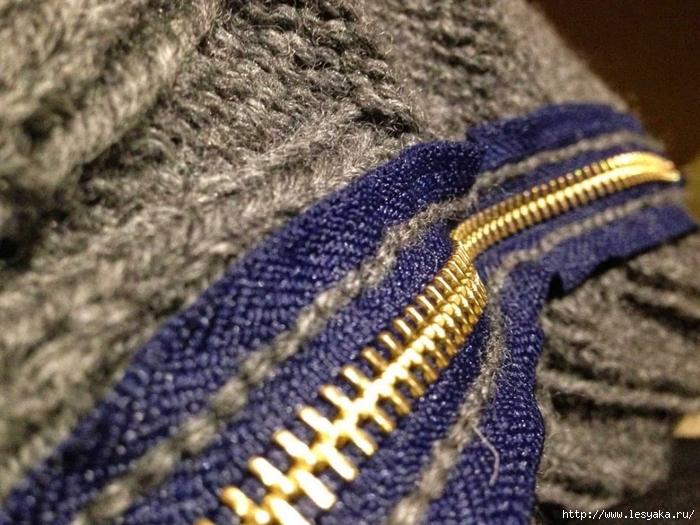 Теперь с помощью толстой иглы и пряжи того же цвета, что и свитер аккуратно вшиваем молнию в изделие, где каждая петелька соответствует определенному ряду.
