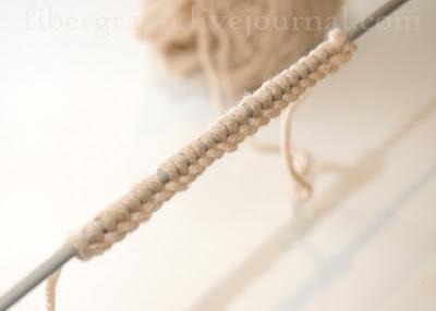 Продолжая вывязывать лицевые петли из промежутка между петлями, обнаруживаем, что по низу работы начинает формироваться витой шнур и с удовлетворением отмечаем, что мы на верном пути.