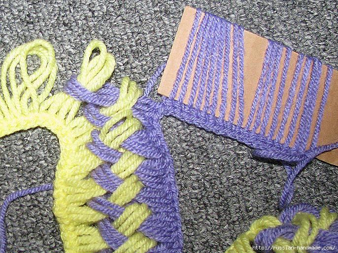 Нужно связать полоску нужной длины, затем ее развернуть и вязать в обратную сторону. Должно получится три одинаковой длины полоски, потом сплетаем их между собой(у меня по три петельки). Сделать бахрому и можно носить!