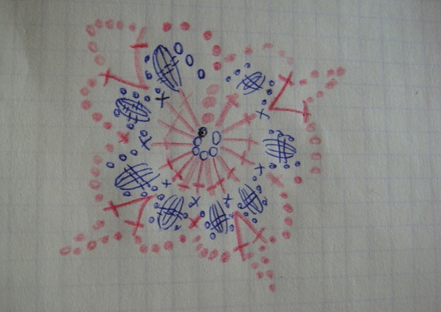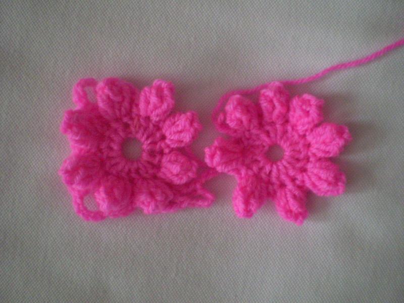 В процессе обвязки пятого ряда, я беру третий цветок пятого ряда(центральный как бы), соединяю его правую боковую часть с верхней частью четвёртого цветка четвёртого ряда и получается уголок центра капюшона.
