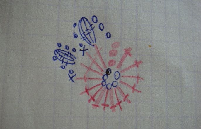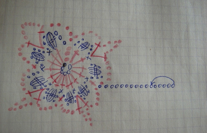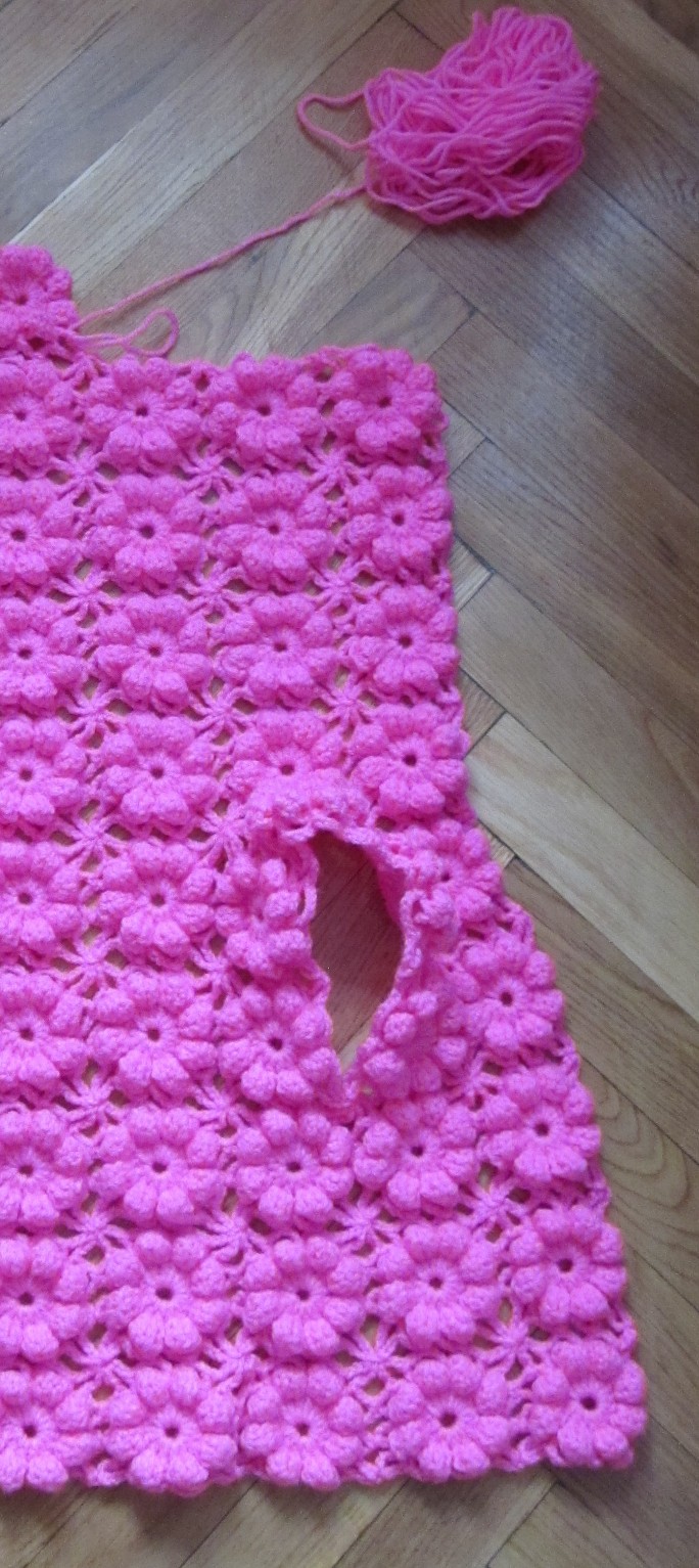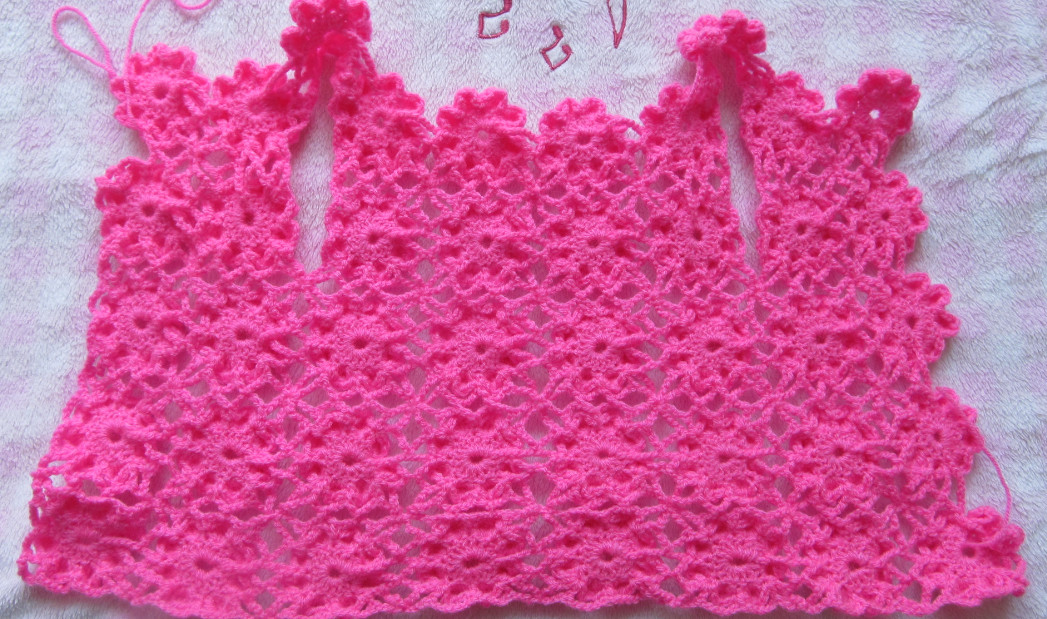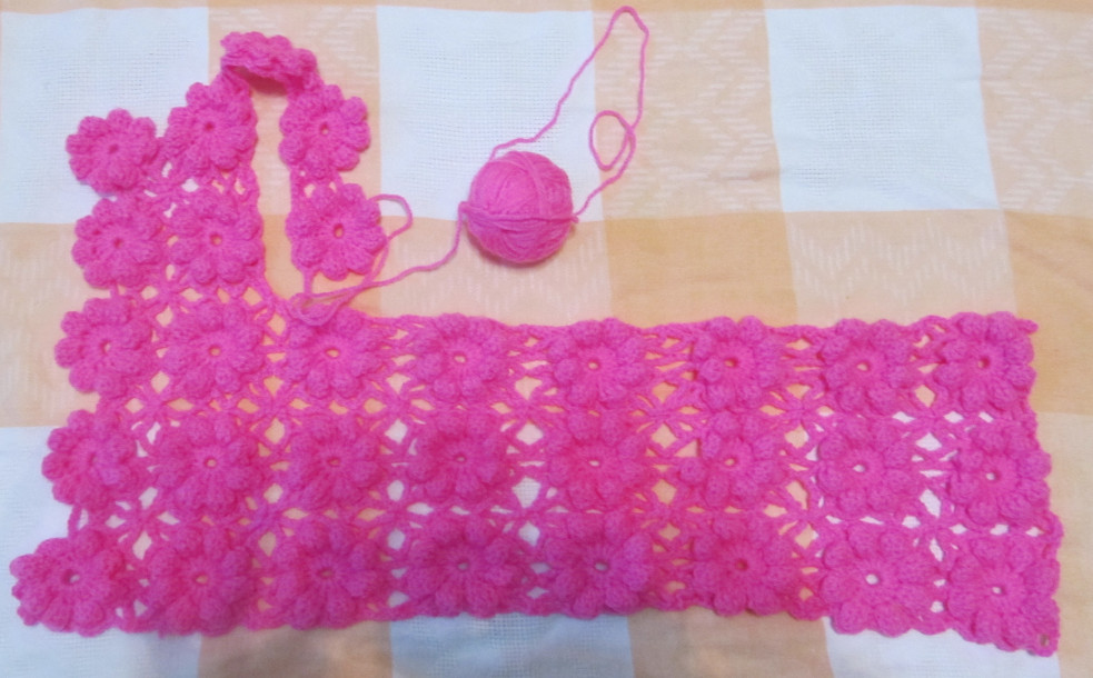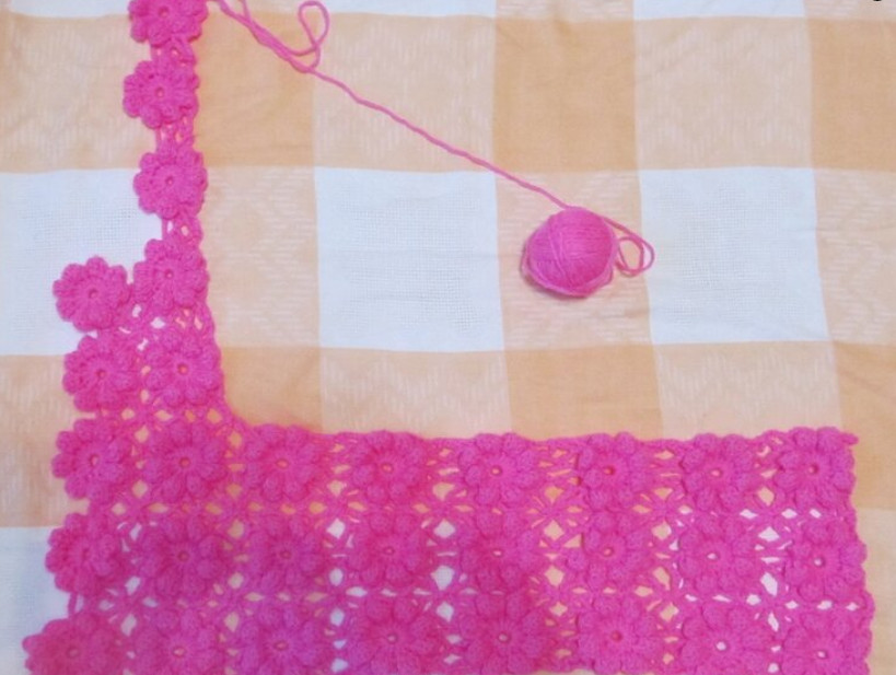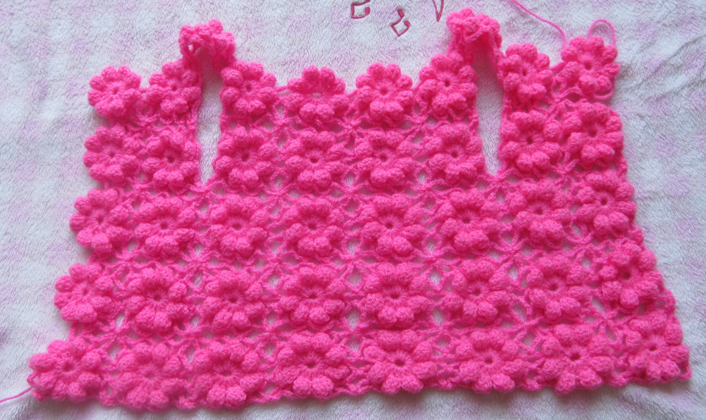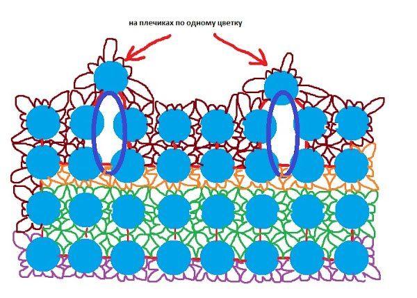 Я связала 3 ряда до проймы, сделала обвязку этого 3-го ряда и вернулась к первому цветку 3- го ряда,затем я связала 2 ряда из 2- цветков(полочка) и вот потом надо вязать вверх 3 цветка, один из них это будет плечо и 2 цветка - это уже спинка.
