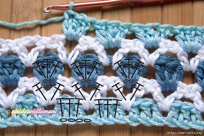 Вот такой чудесный нежный плед можно связать крючком. Смотрите схему вязания узора пышными столбиками и дерзайте! Далее смотрите в Источнике...