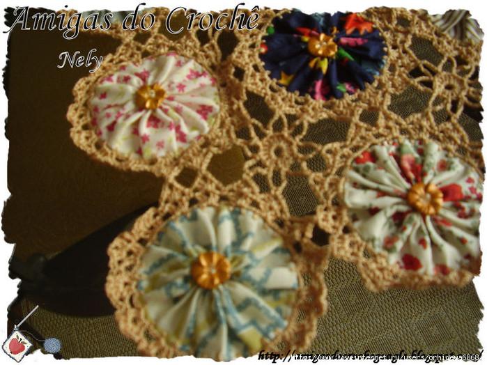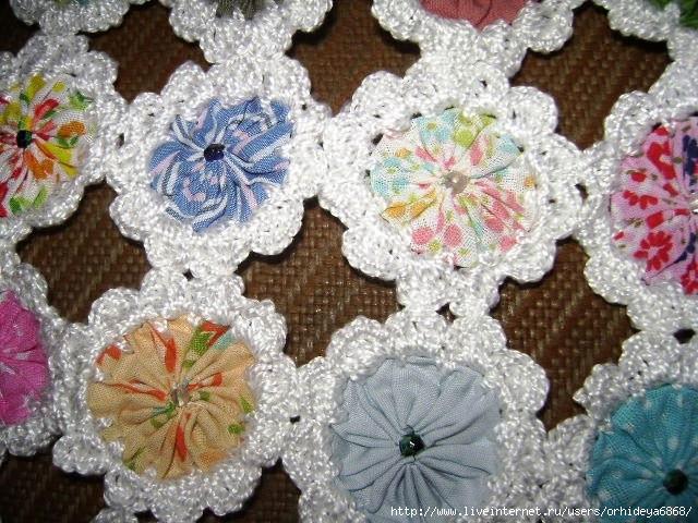 Сочетание вязания с тканью дает просто необыкновенный эффект! Произведения, созданные таким способом смотрятся ажурно, изящно, ярко и очень необычно! Конечно, такой шедевр не для начинающих, но опытные вязальщицы, думаю, справятся с удовольствием.