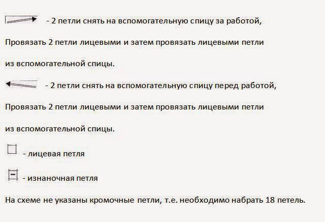 - связать 4 ИЗ, снять дополнительной спицей 2 петельки и оставить их за рисунком;