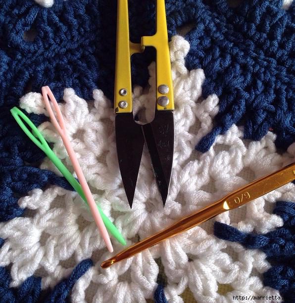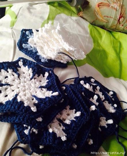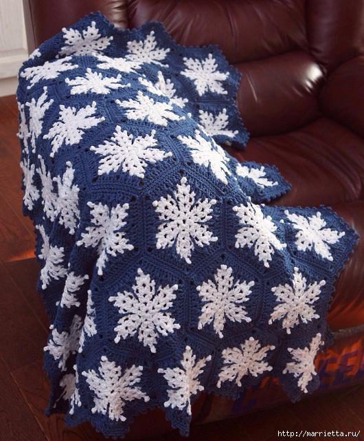 Такой красивый плед со снежинками украсит ваш дом и создаст в нем теплую и уютную атмосферу, несмотря на холодные зимние вечера, а так же явится чудесным подарком для ваших родных и близких. Схему пледа со снежинками, связанного крючком из отдельных мотивов, смотрите ниже.