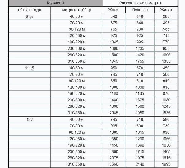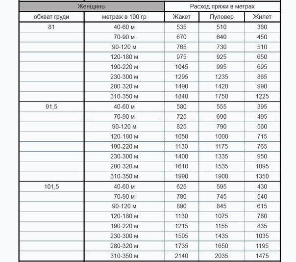 Таблица расхода пряжи для вязания изделий