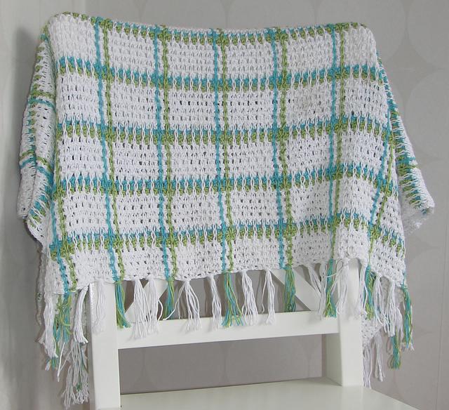 Насколько я знаю, такое вязание называется «шотландское». Связав крючком простым мотивом полотно одного цвета для скатерти или пледа, например, посмотрите мастер-класс, как можно по нему сделать украшение тоже крючком, но нитками других цветов. По-моему замечательно получается!