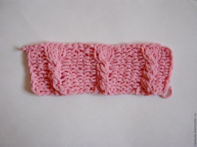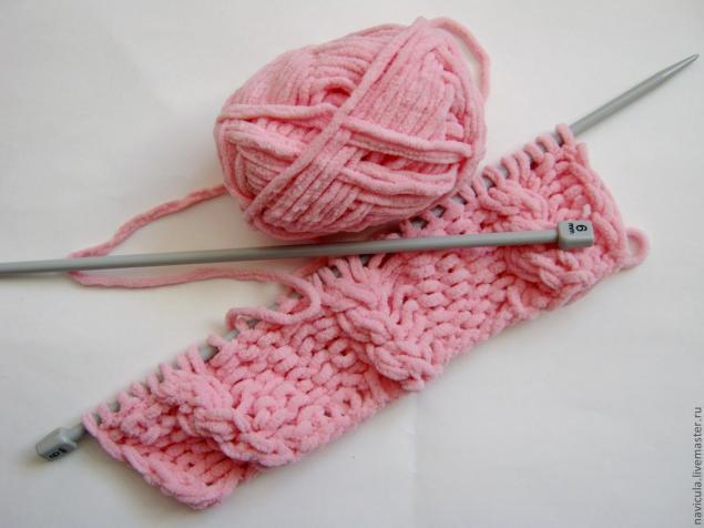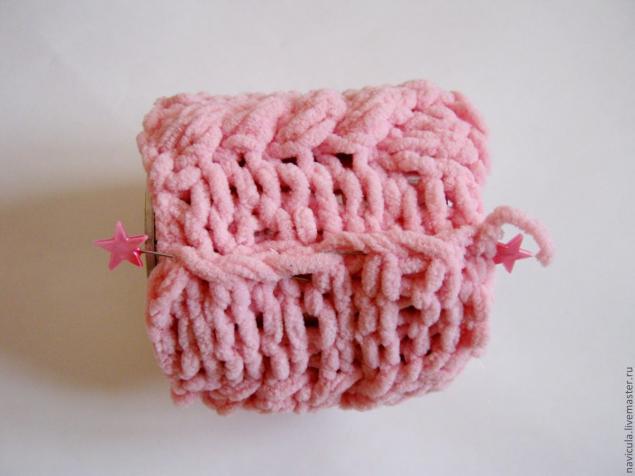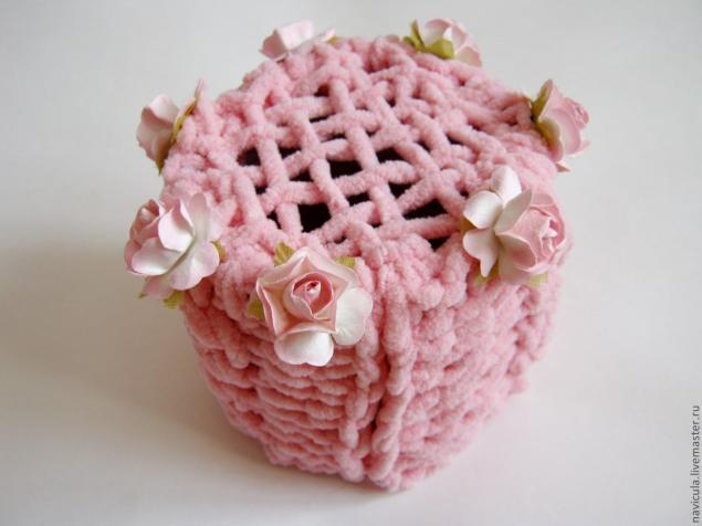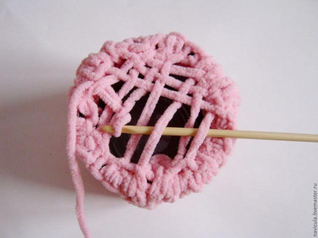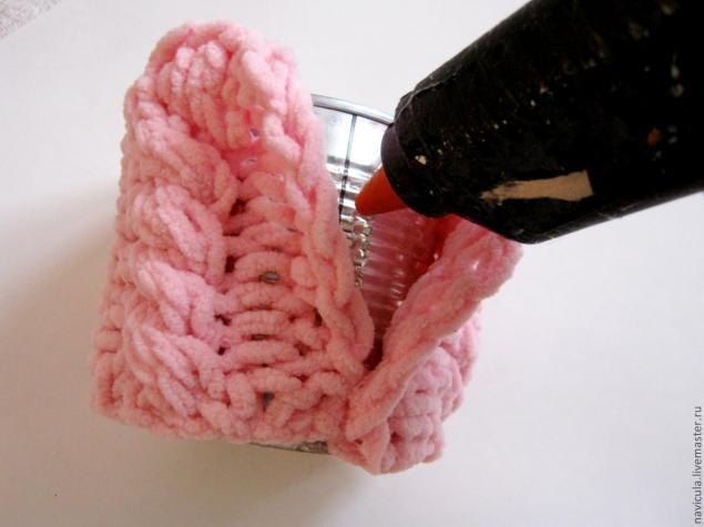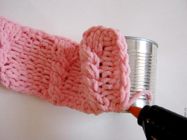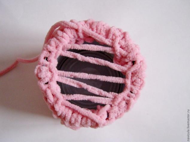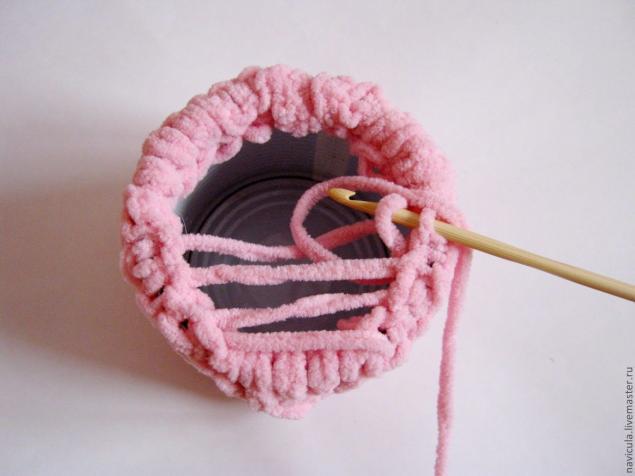 Вяжем полотно, ширина которого соответствует обхвату емкости, а высота превышает высоту емкости на сантиметр-два. В процессе даем волю фантазии.