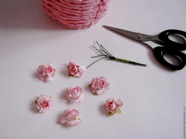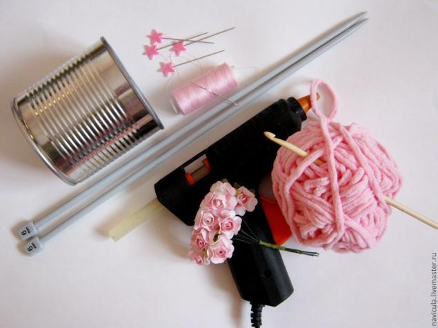 Пряжа, спицы и/или крючок подходящего номера, емкость для декорирования (у меня простая консервная банка), клеевой пистолет или другой быстросохнущий клей, булавки, нитки в тон пряже, декоративные элементы (в моем случае бумажные розочки), иголка, ножницы.