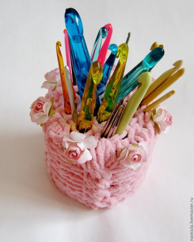 У меня остался моток толстой плюшевой пряжи, давший мне вдохновение для создания этого мастер-класса. Сетчатая верхняя поверхность не позволяет крючкам болтаться, и облегчает поиск и извлечение нужного инструмента. Подходит такой вариант и для хранения чулочных спиц, когда весь комплект одного диаметра находится в своей ячейке.