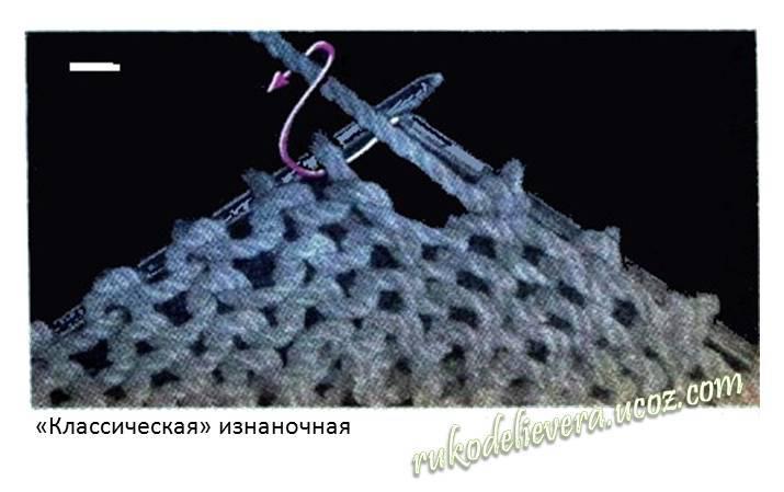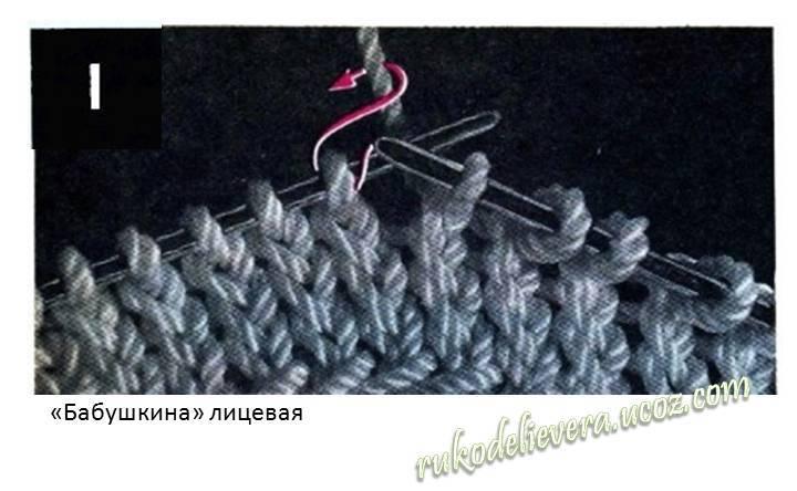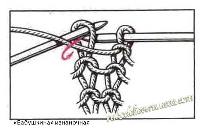 Снимите кромочную и расположите рабочую нить перед левой спицей. Правую спицу введите в петлю справа налево за рабочей нитью, затем подведите нить под конец правой спицы, втяните ее в петлю и переведите новую петлю с левой спицы на правую. Изнаночная, выполненная этим способом, соответствует «бабушкиной» лицевой.