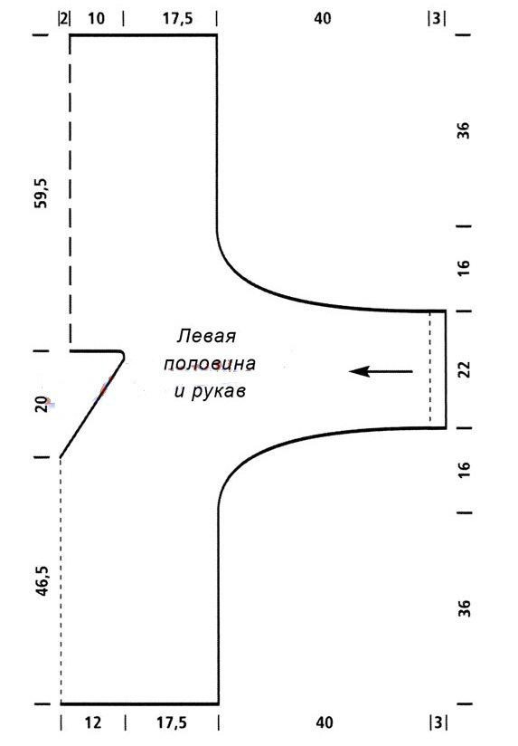 Внимание! Кардиган вязать как одну деталь, начиная с манжеты левого рукава. Стрелка на схеме указывает направление работы.