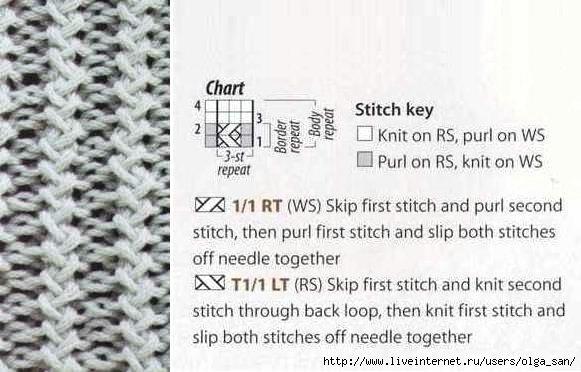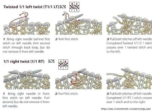 1-й ряд (лицевая сторона): *2 лицевые перемещенные петли (2-ю петлю провяжите лицевой за заднюю стенку, не снимая с левой спицы, 1-ю петлю провяжите лицевой, затем обе петли предыдущего ряда снимите с левой спицы), 2 изнаночные*.
