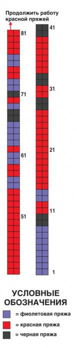 - 65 г красной, 20 г фиолетовой, немного черной пряжи (100% акрил, 150 м/50 г);