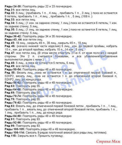 Через 57 см = 176 рядов (61,5 см = 190 рядов) от планки закрыть оставшиеся по 28 (37) п. плеч.