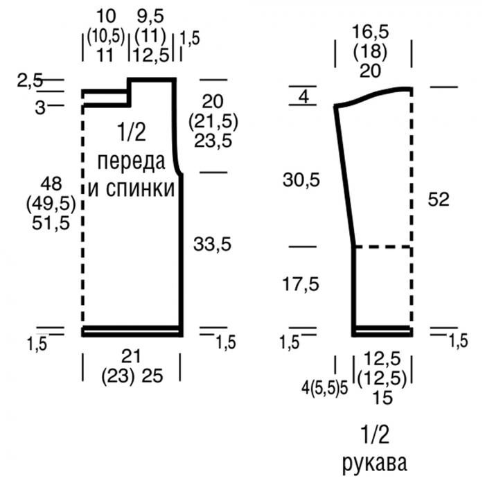 Через 51 cм = 188 р. (52,5 см = 194 р.) 54,5 cм = 202 р. от нижней планки закрыть для горловины средние 49 (51) 53 п. и обе стороны закончить раздельно. Оставшиеся 23 (27) 31 п. плеча закрыть в одном ряду через 53,5 cм = 198 р. (55 cм = 204 р.) 57 cм = 212 р. от нижней планки.