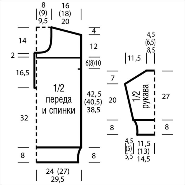 Вязать, как спинку, но с более глубокой горловиной. Для этого средние 49 (51) 53 п. закрыть через 48 cм = 178 р. (49, 5 cм = 184 р.) 51,5 cм = 192 р. от нижней планки и обе стороны закончить раздельно, как на спинке.